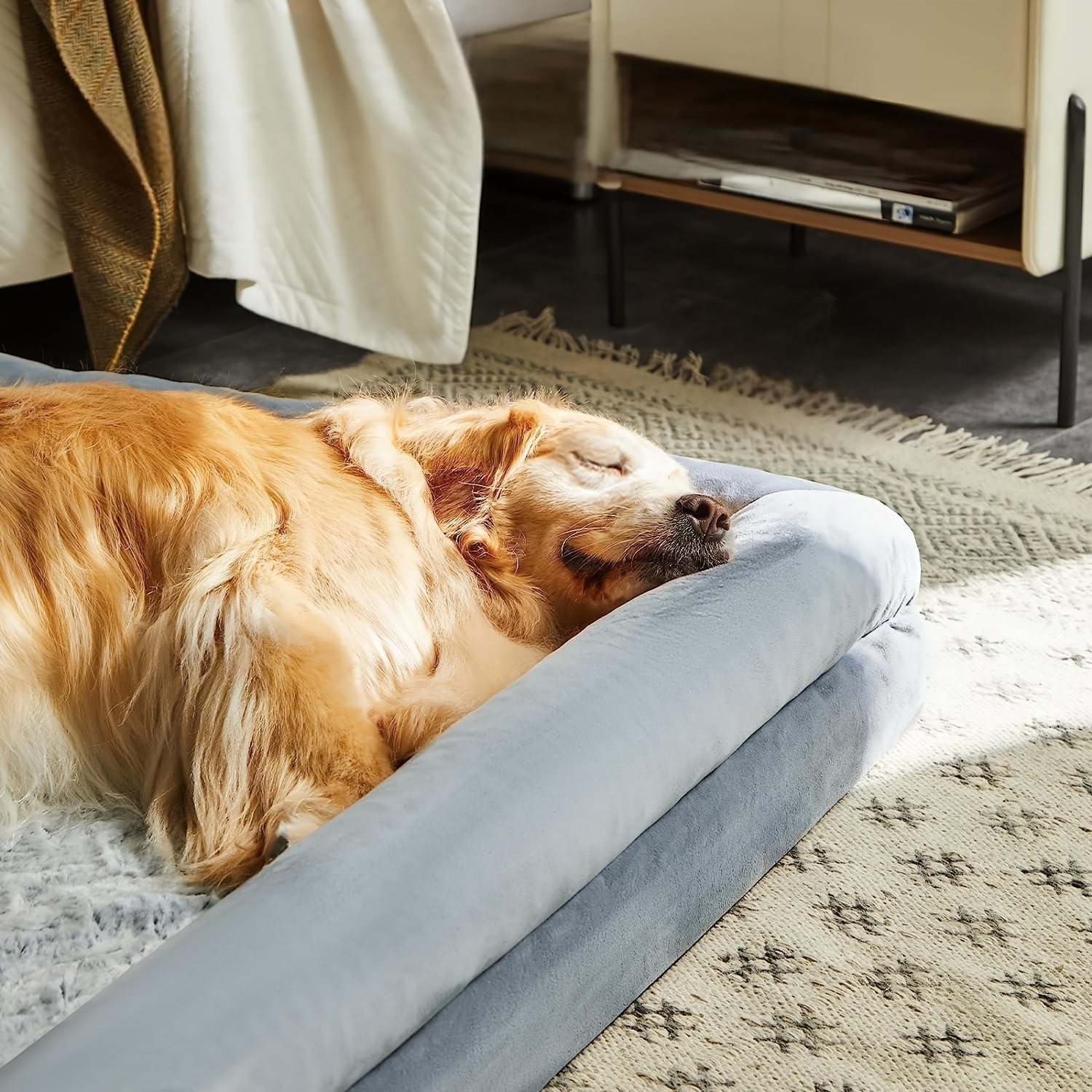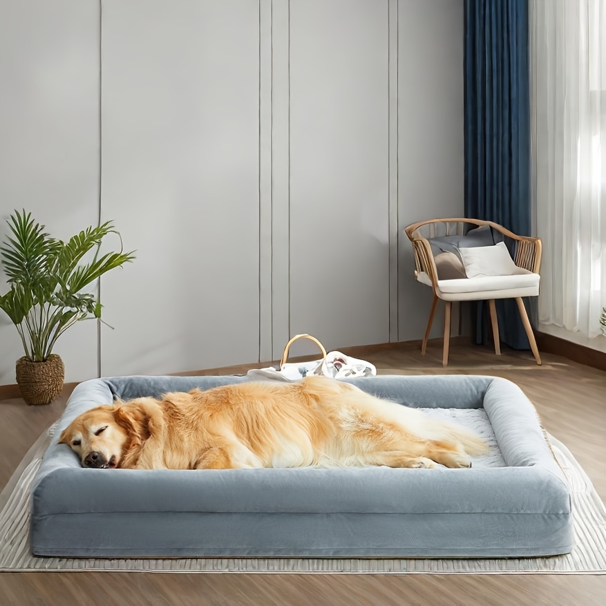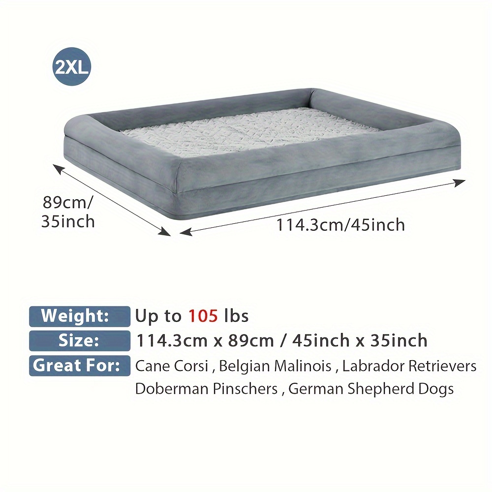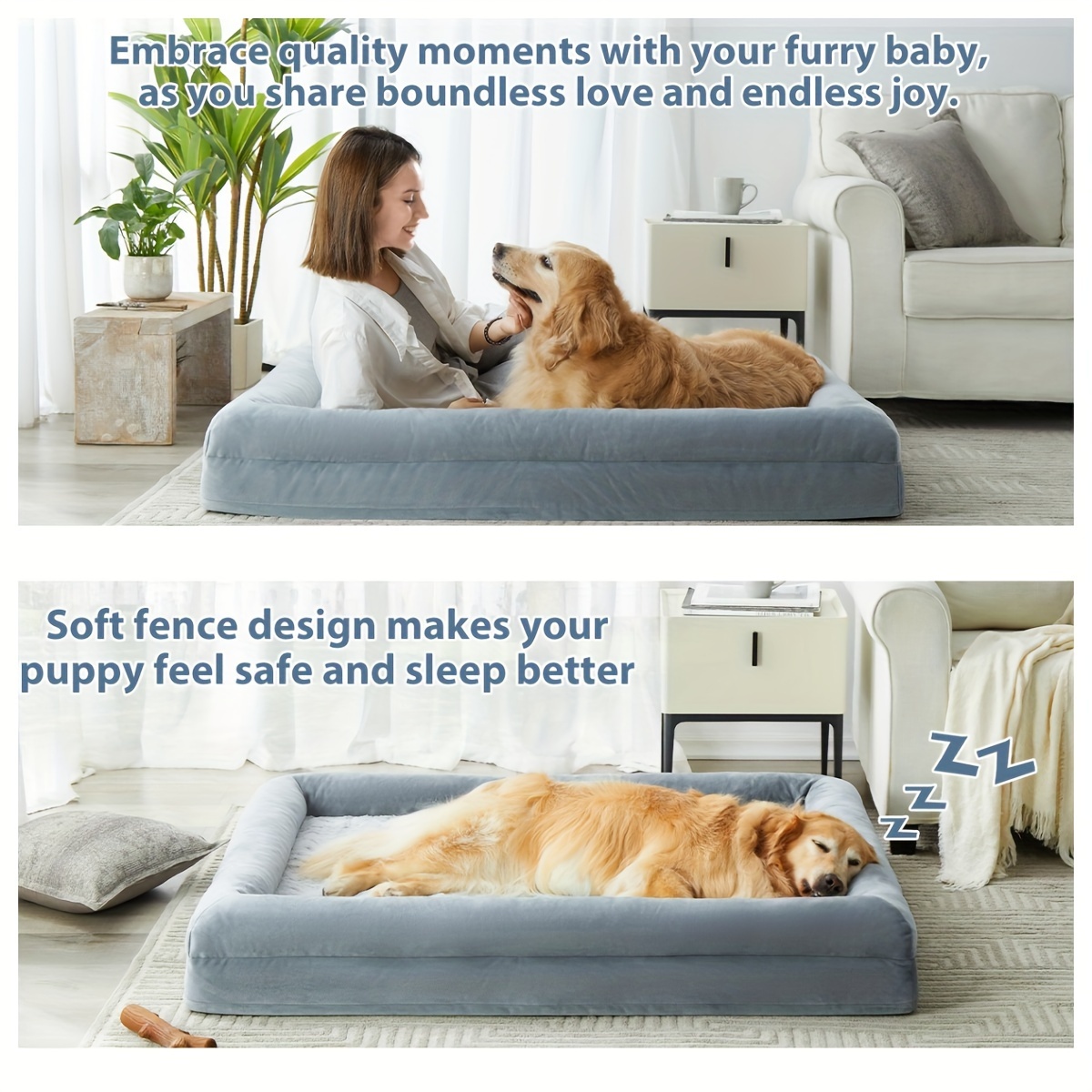The Jumbo Sofa Dog Bed offers unmatched comfort and support with memory foam cushioning, bolstered edges, and a soft velvet cover. Designed for pets of all sizes, it features a washable, waterproof cover and an anti-slip base for effortless maintenance and stability.